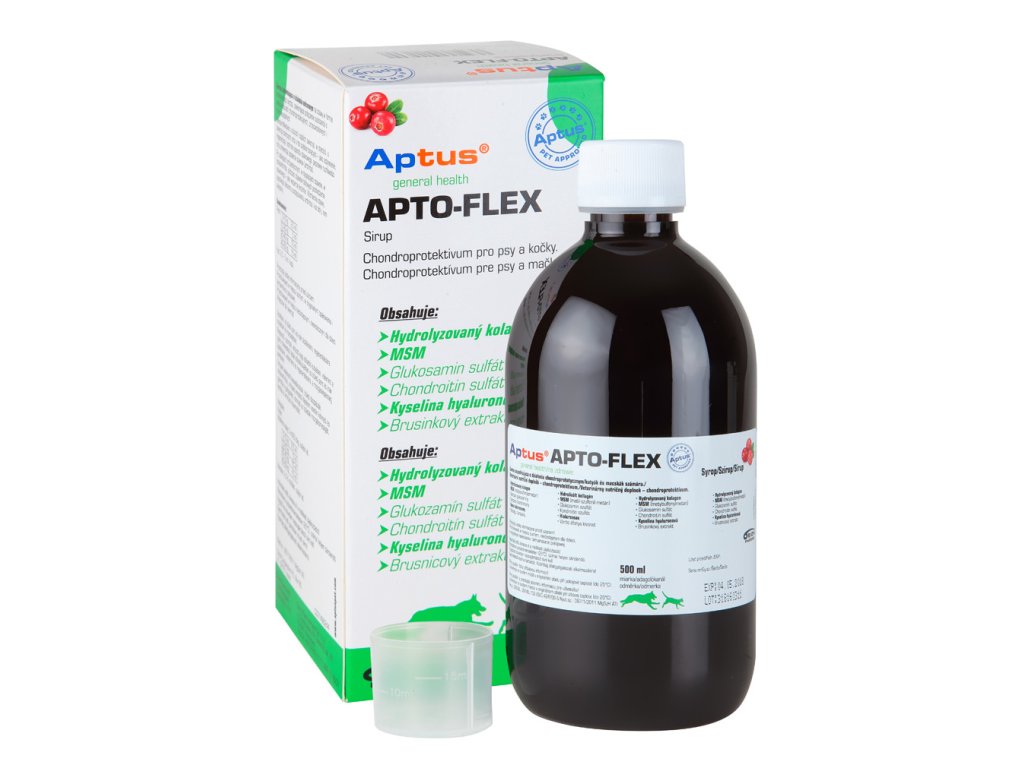APTO-FLEX sirup je unikátní pětisložkové solubilní chondroprotektivum s kyselinou hyaluronovou a antioxidanty pro psy a kočky. Obsahuje kys. hyaluronovou, MSM, kolagen, glukosamin sulfát, chondroitin sulfát a antioxidanty (brusinkový extrakt).