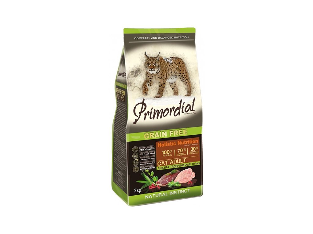 Primordial kachna a krůta pro dospělé kočky je kompletní vysoce stravitelné bezobilné krmivo bohaté na bílkoviny vysoké biologické hodnoty a obsahuje vhodnou kompozici aminokyselin. Kachní a krůtí maso, striktně z volného výběhu nabízí jednoduše stravitelné bílkoviny a atraktivní chuť, kterou kočky milují. Toto krmivo, obohacené o ovoce a zeleninu, které poskytují vitaminy, minerály a fytonutrienty, o lespedézii s blahodárnými účinky na močové cesty, brusinky s antioxidační funkcí a lněné semínko, kvalitní zdroj omega 3 mastných kyselin, které vykonávají důležitou kosmetickou funkci pro kůži a srst, představuje dokonalou rovnováhu chuti a živin. Jedná se o skutečně holistický produkt, který aktivně přispívá k celkovému zdraví kočky.