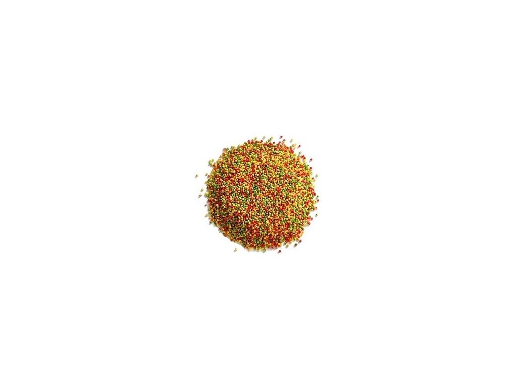 Složení: loupané proso, vit. A, D3, E, B1, B2, B6, B12, K3, kyselina listová, kyselina nikotinová, pantothenan vápenatý, biotin, jodičnan vápenatý bezvodý Ca(IO3)2, Barviva: tatrazin, azorubin, patentní modř.